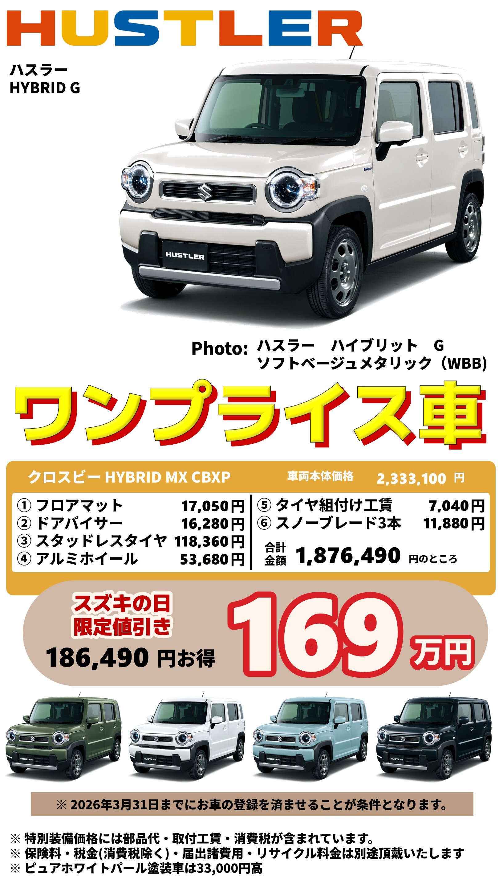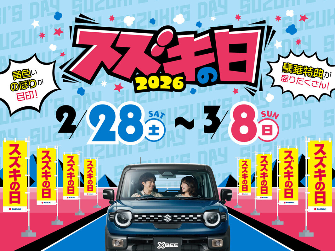 イベント/キャンペーン 2026.03.02 スズキの日!!大盛況開催中です!! ※このイベントは終了しました ◠◠ ◠◠ いつもホームページを ご覧いただき ありがとうございます ◡◡◡◡◡◡◡◡◡◡◡◡◡◡◡◡◡◡ 2月28日(土) ~ 3月8日(日) 「スズキの日」 開催 ※ ジムニーノマドは抽選プレゼント対象外となります。