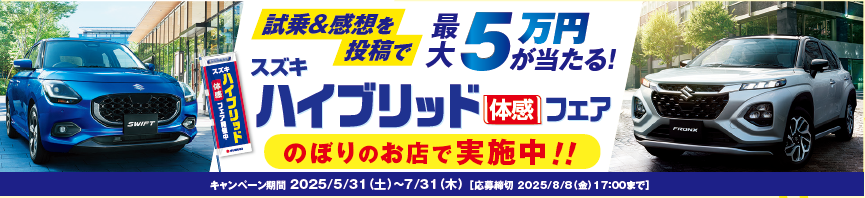 スズキハイブリッド体感フェア 7月31まで! 最大選べるPay5万円分あたる!