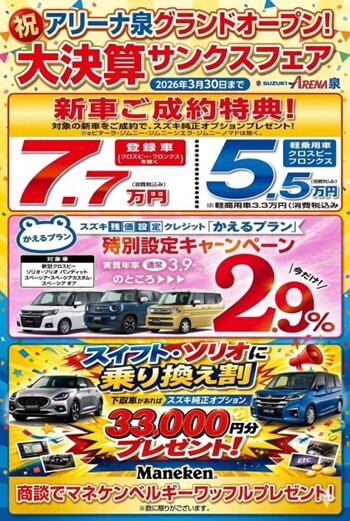 イベント/キャンペーン 2026.03.16 ★★アリーナ泉グランドオープン!サンクスフェア開催★★ ※このイベントは終了しました いつもスズキアリーナ泉店のブログを ご覧頂きありがとうございます そんな皆様に朗報です アリーナ泉グランドオープン!サンクスフェア 開催いたします 2026年3月30日まで 試乗車や展示車 ご商談特典等 ご用意しております この今しかない機会に是非 皆様のご来店心よりお待ちしております