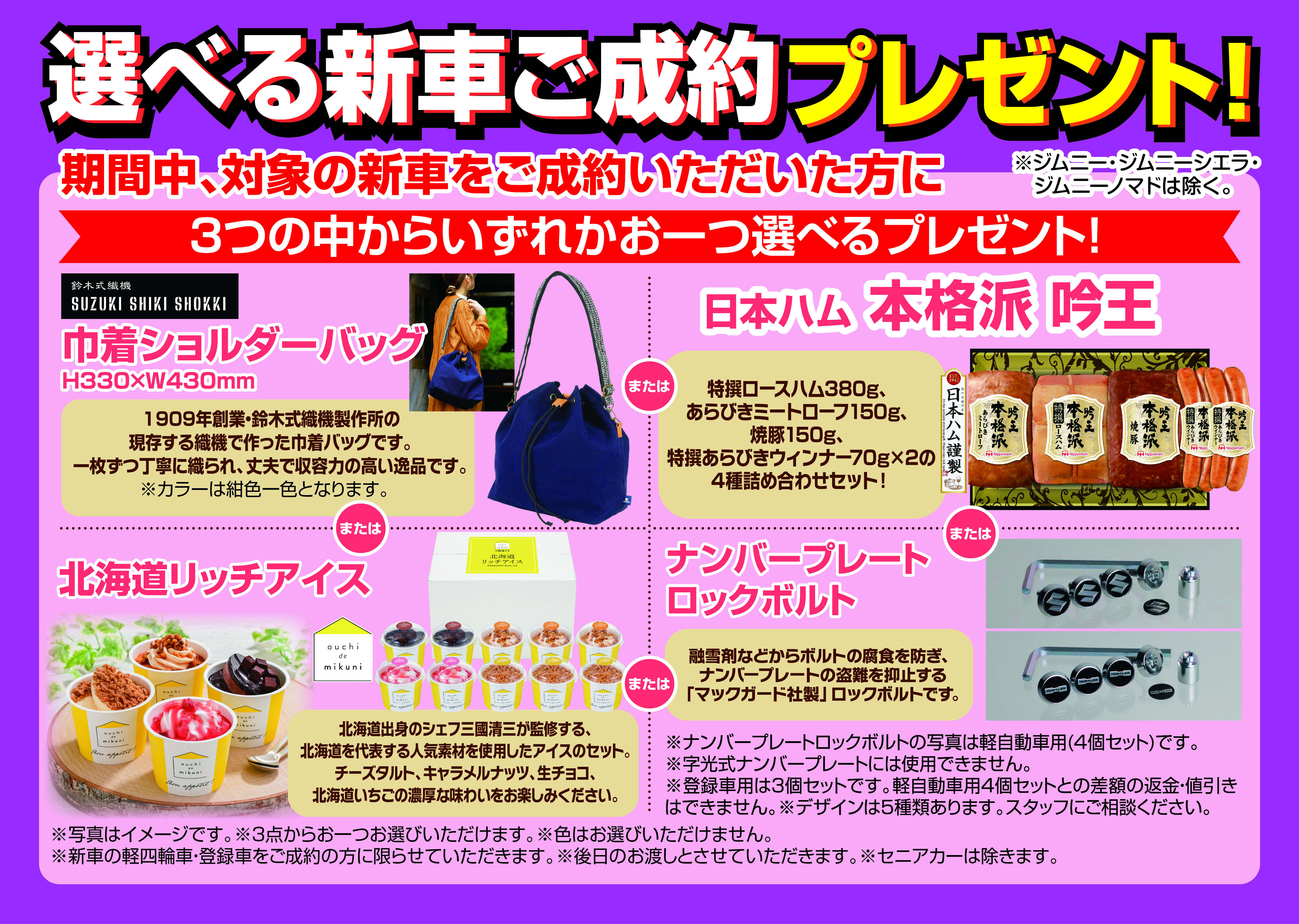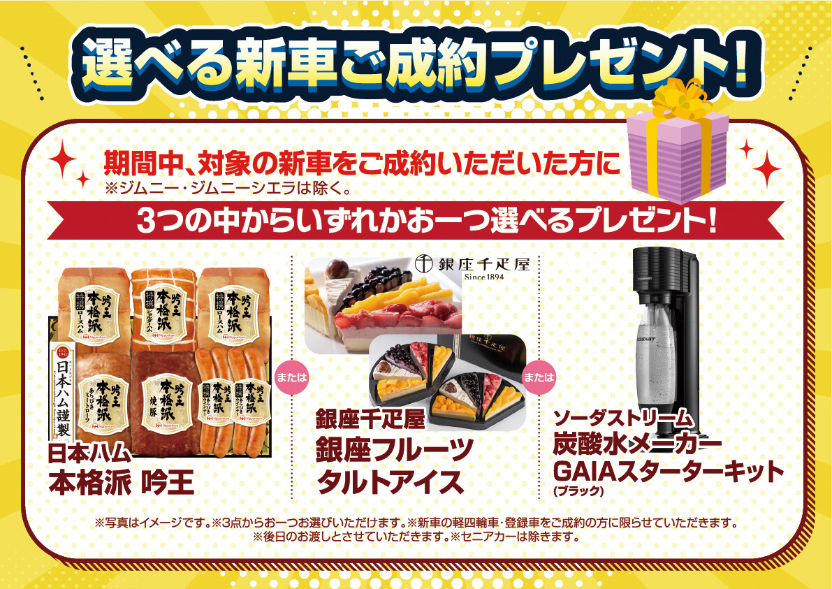 期間中、対象の新車をご購入いただいた方に選べるプレゼント