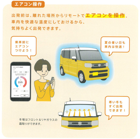 スマホで車が操作できるので、エンジンをかける前にエアコンをつけておくことも可能です。