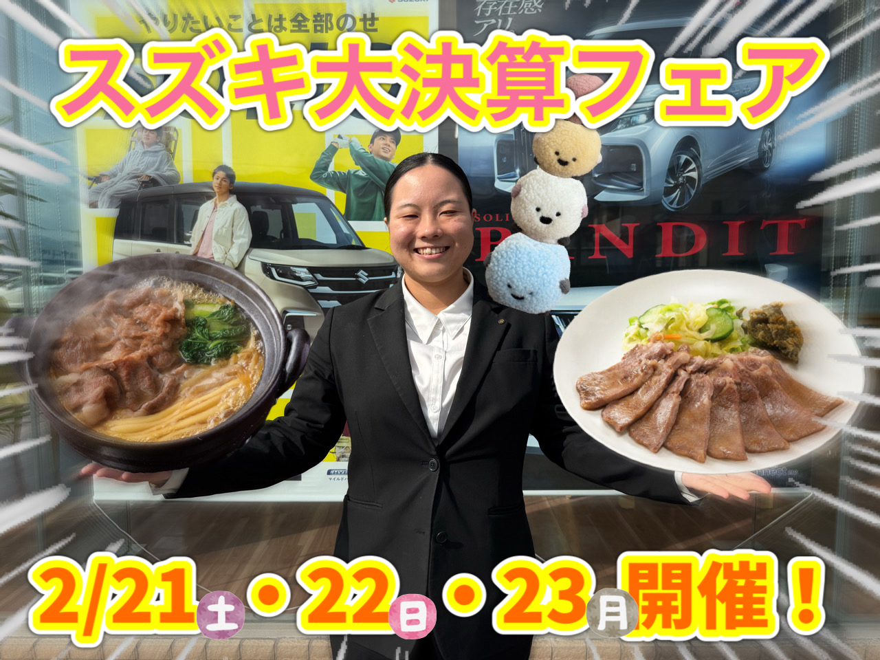 イベント/キャンペーン 2026.02.16 スズキ大決算!!まだまだやってます!!! みなさまこんにちは!! スズキアリーナ青田 かとうでございます! 14日・15日開催のアリーナ祭ではたくさんのご来店、 ありがとうございました! 本日のブログでは 週末開催のイベントをご案内いたします!! 2月決算も終了間近・・・そして来る21日、22日、23日! スズキ大決算開催です お得な特典もいっぱいです! この春、新社会人になる学生の方や、車検までのお乗り換えを検討の方も いまならお得に新車が購入できるチャンス ぜひ新生活に備えて、ご検討くださいね みなさまのご来店お待ちしております