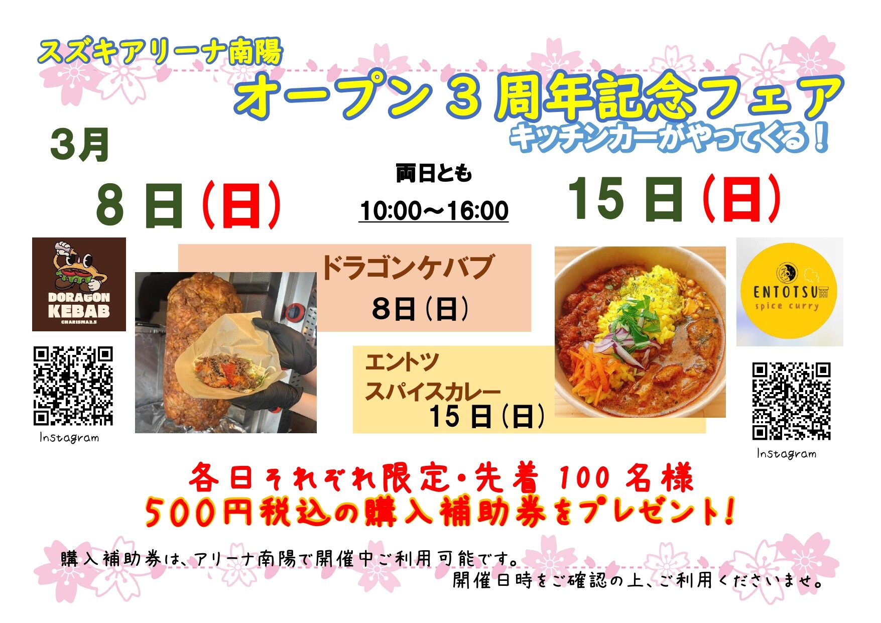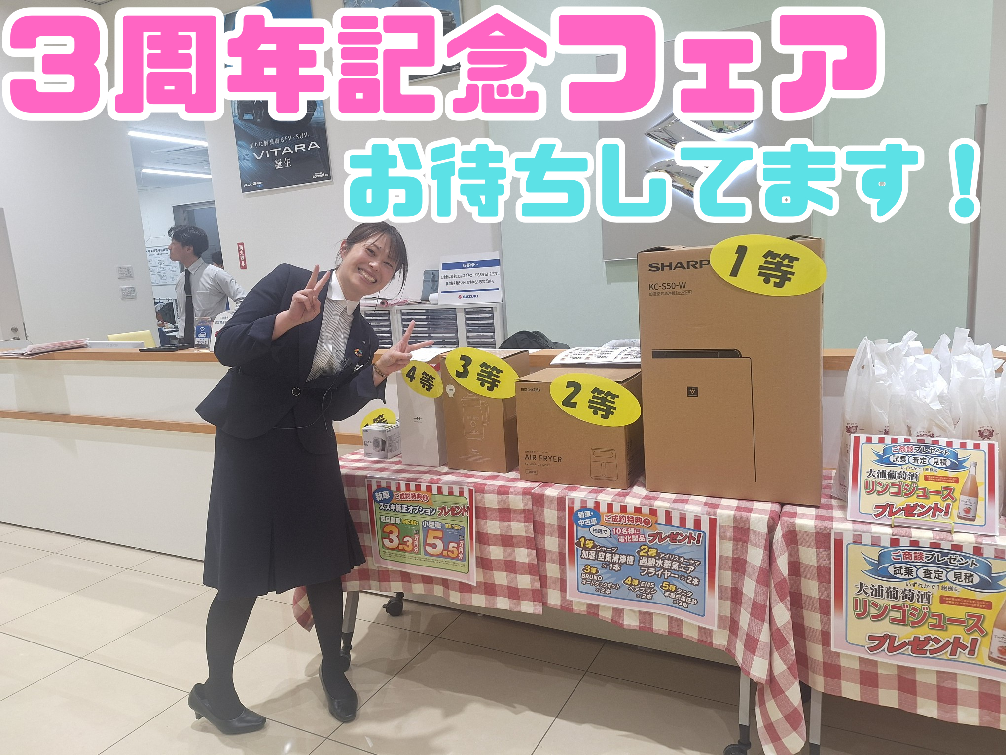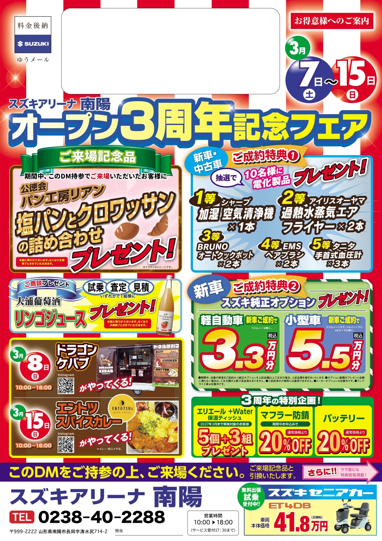 イベント/キャンペーン 2026.03.06 明日から3周年記念フェア開催します! みなさんこんにちは スズキアリーナ南陽の布施です ついに明日から アリーナ南陽 3周年記念フェア 開催します! ご来場記念品やご成約記念品をたくさんご用意しております! 8日と15日はキッチンカーも来ます! 皆様のご来店をお待ちしております