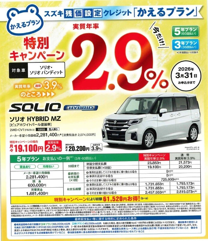 キャンペーン期間中に対象車種をスズキ残価設定クレジット「かえるプラン」にてご契約いただくと、以下の条件でお取扱いいただけます