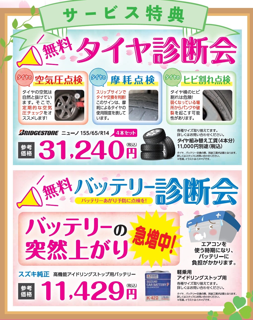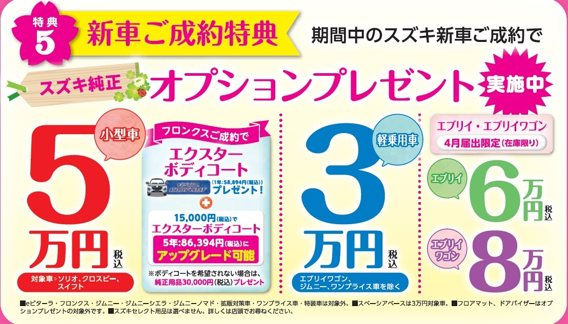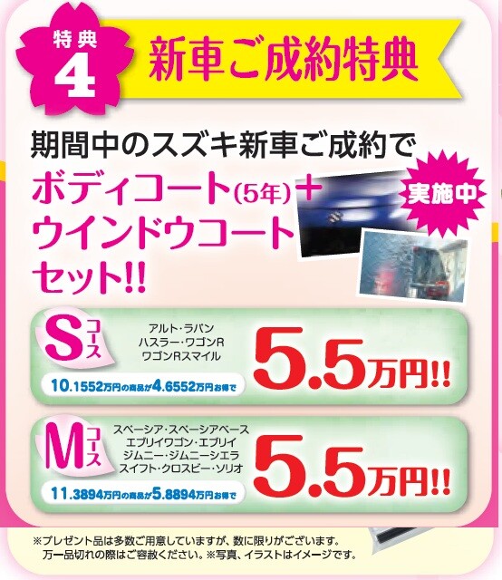 イベント/キャンペーン 2026.04.13 春の大感謝祭開催中!! いつもスズキアリーナ佐野のブログをご覧いただき ありがとうございます 先週は温かいというよりもむしろ暑い という日が多かったですね そんな今週は、、、 まだまだ続きます!! 春の大感謝祭 ご来場特典 ご商談特典 お車ご成約で オプションプレゼント ボディコート(5年) +ウィンドウコート 診断会も開催します 車のメンテナンス いかがですか 4月もお得な時期となっております 是非、皆様のご来店をお待ちしております