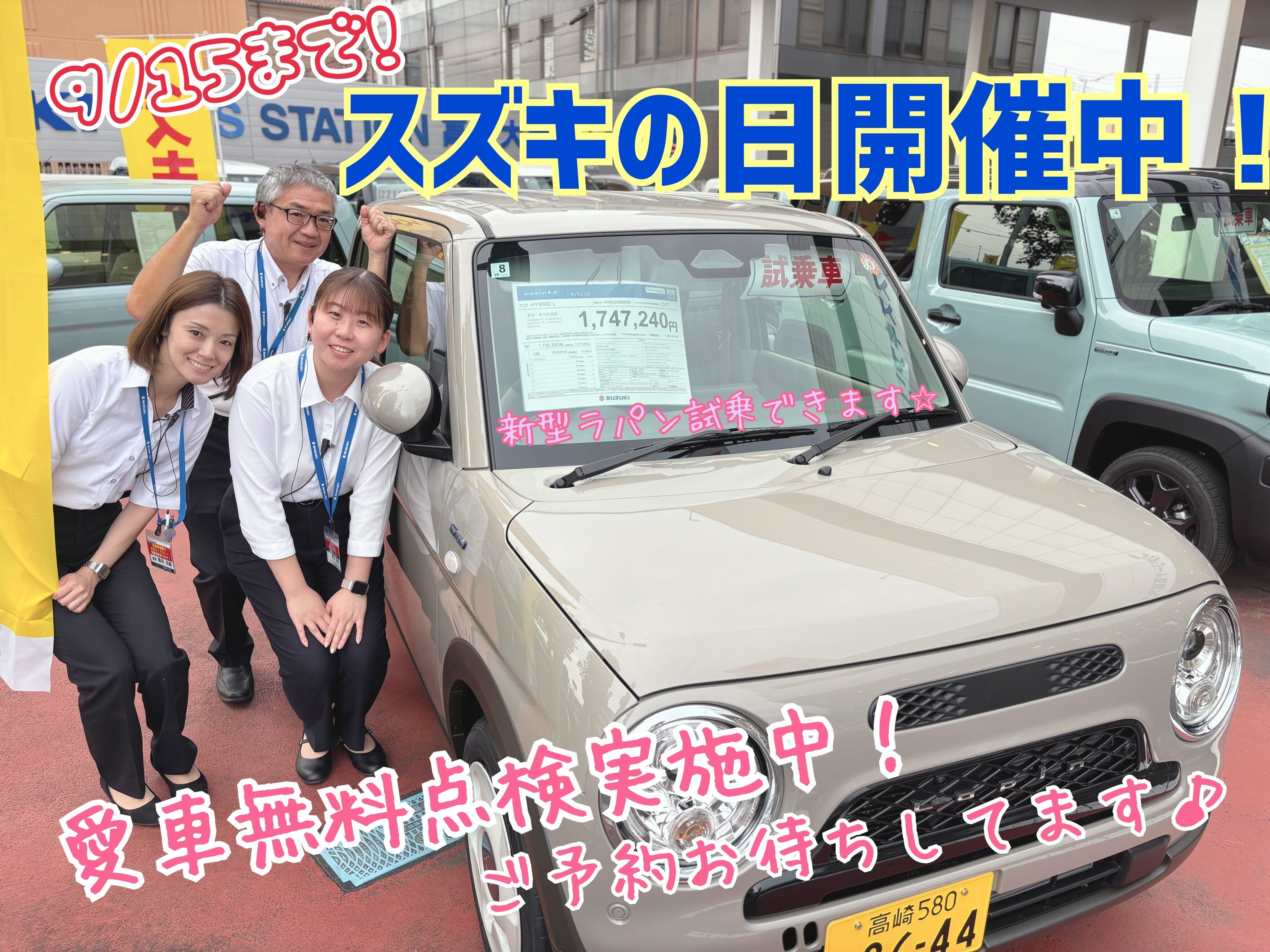 本日9月1日(月)より愛車無料点検開催!新車購入がとってもお得な【スズキの日】は9月15日(祝)まで!ソリオ・スイフト・スペーシアなどなど人気の車が大特価!お見逃しなく!!