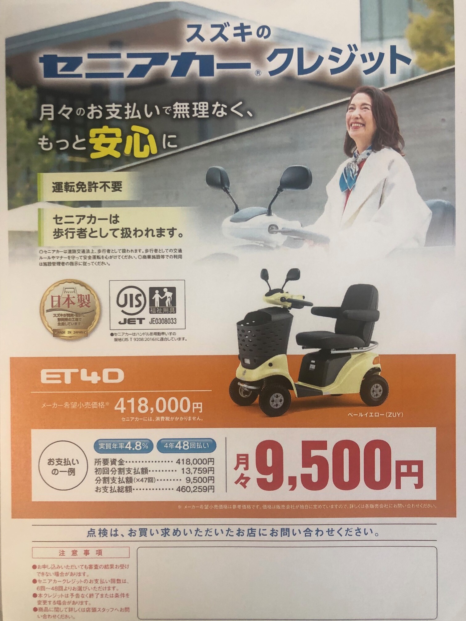 セニアカーもクレジットがご利用いただけます。月々9500円で楽々お支払い。