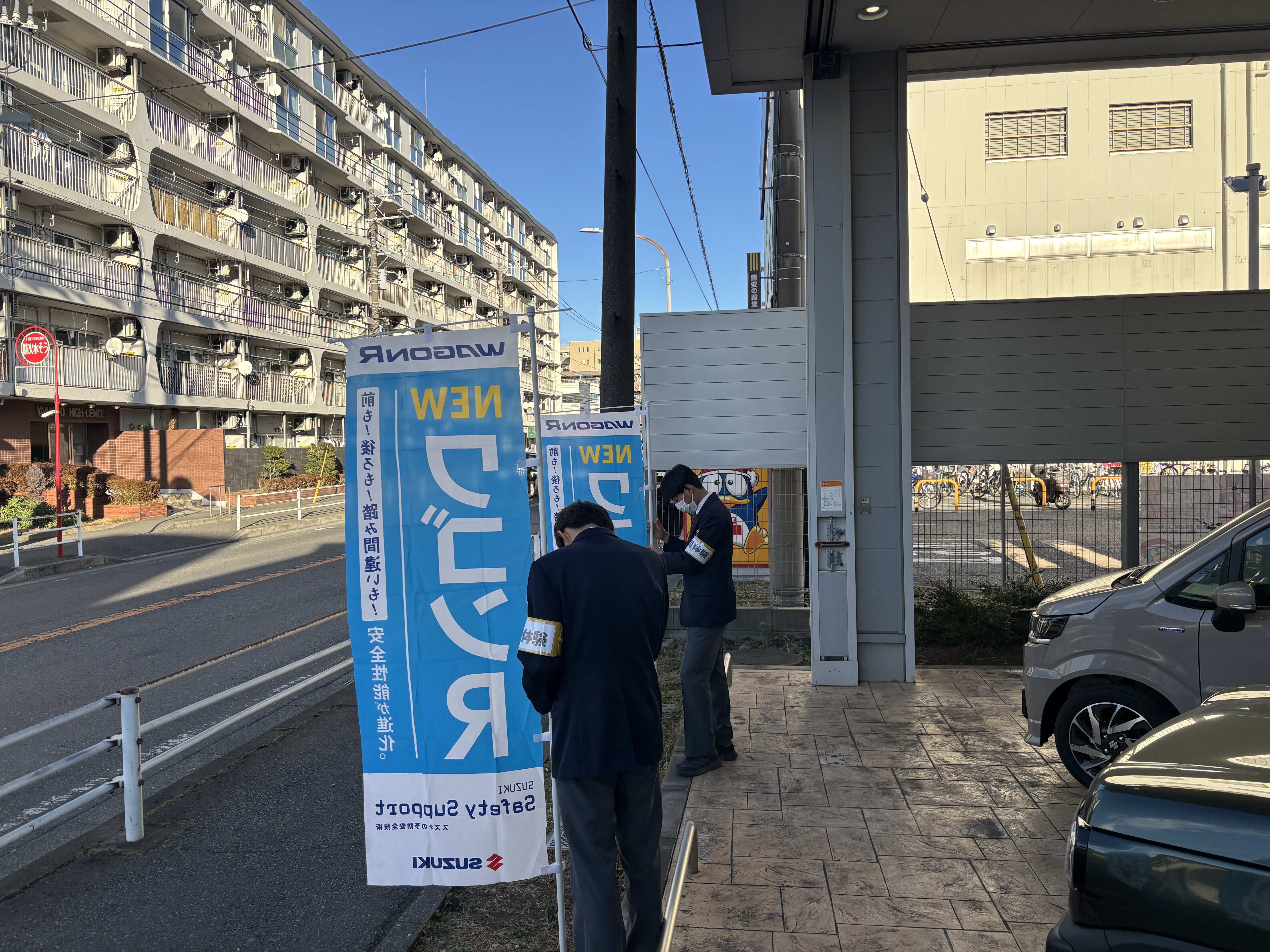 展示車の鍵の開錠や、のぼりの準備をしてもらいました