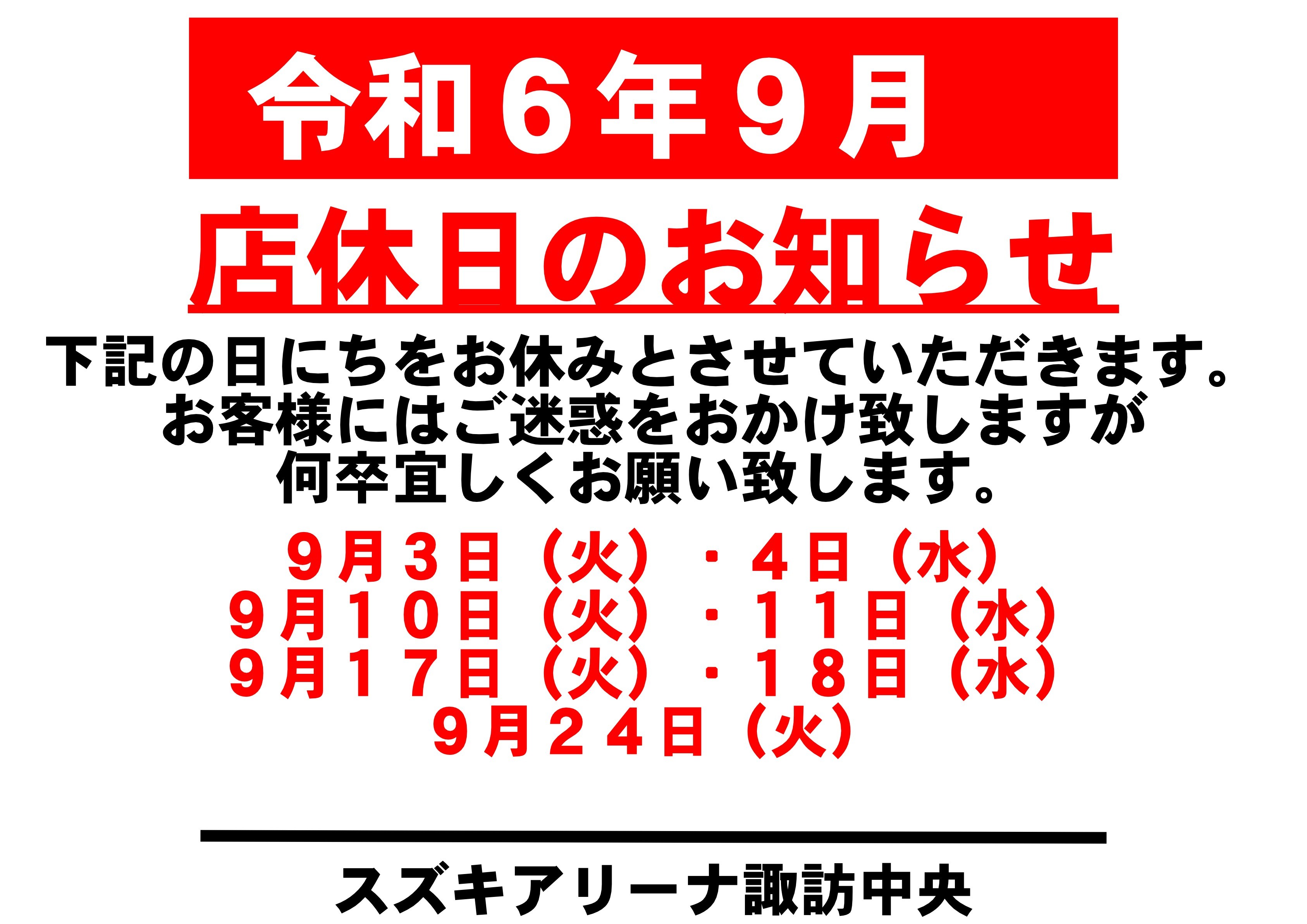 令和6年9月 お休みのご案内