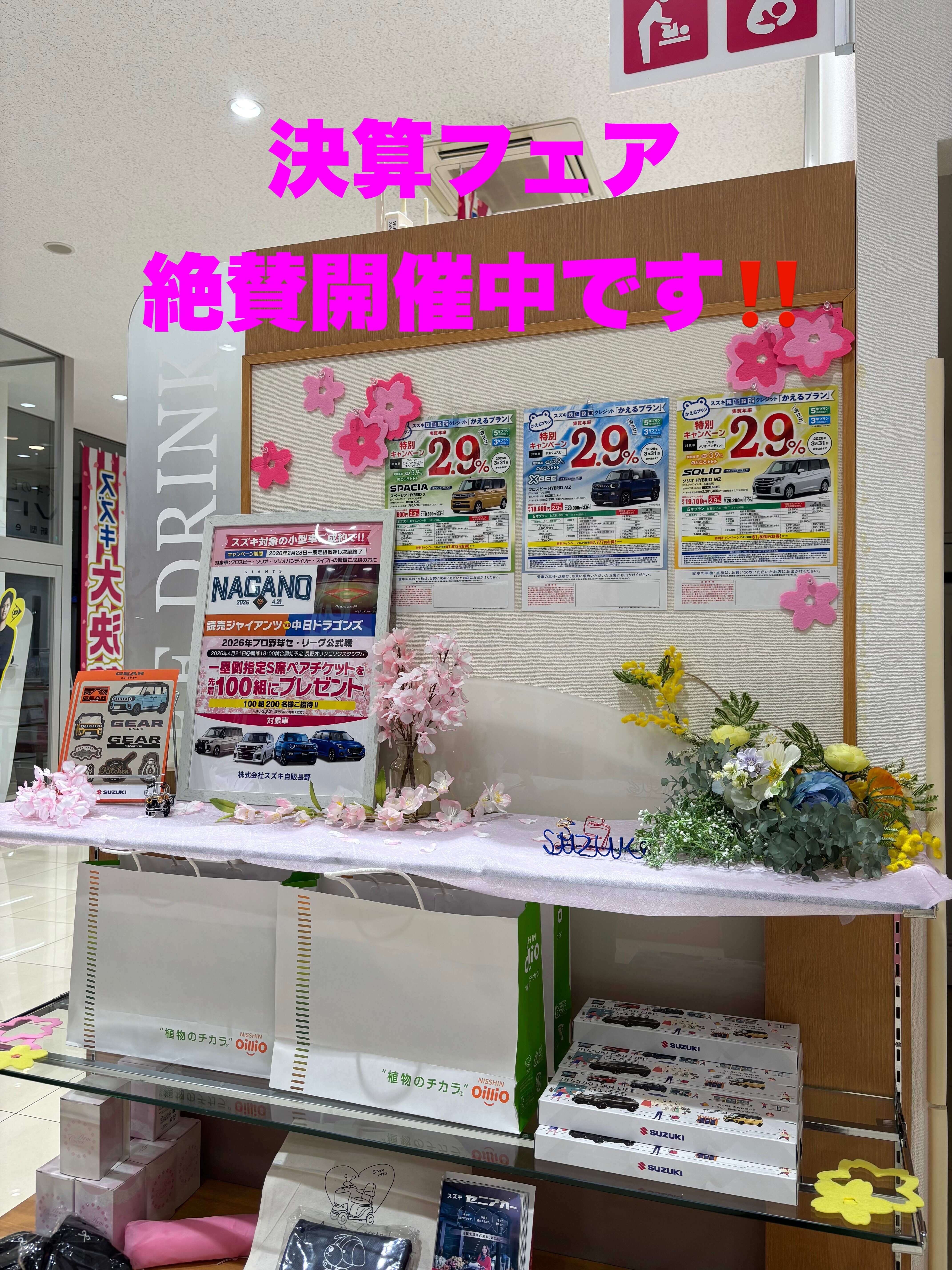 イベント/キャンペーン 2026.03.05 決算フェアまだまだ続きます! ※このイベントは終了しました いつもブログをご覧頂きありがとうございます ただいま決算フェアが好評開催中です 店内も春仕様になりました 写真にもありますが、この3月は かえるプラン特別金利キャンペーン中です スペーシア、ソリオ、クロスビーは 今だけ2.9%です そしてさらには・・・ プロ野球の観戦チケットも用意しております スイフト、ソリオ、クロスビーをご検討の方で 野球ファンの方は 早い者勝ちですのでお急ぎください この週末はぜひ当店へご来店下さい