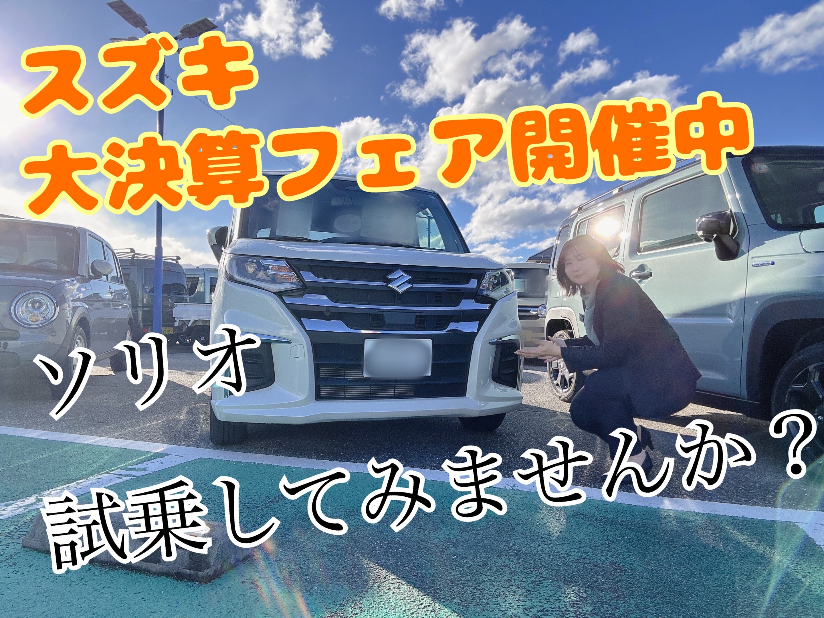 イベント/キャンペーン 2026.02.06 大決算フェア開催中です! ご成約特典 クロスビー、ソリオ、スイフトは オプション5万円分プレゼント 軽自動車は オプション3万円分プレゼント クロスビー、ソリオ、スペーシアは 特別金利も実施中 お得な期間にご来店ください!