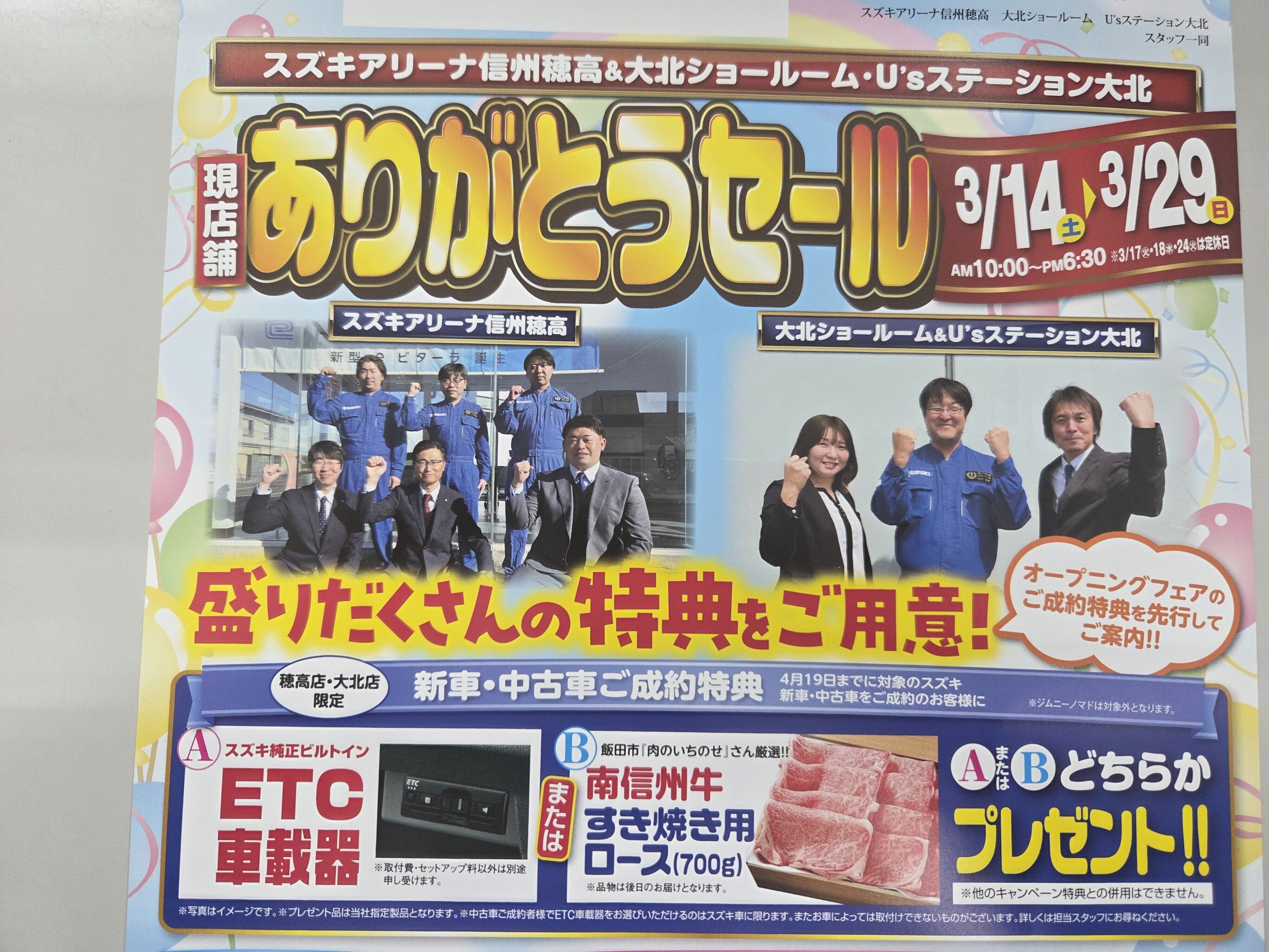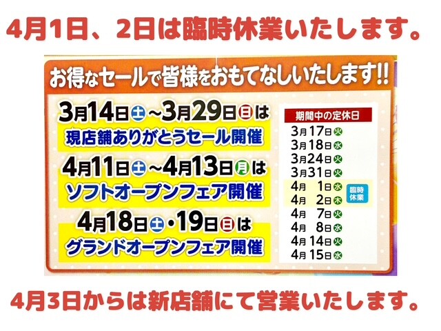 イベント/キャンペーン 2026.03.26 現店舗ありがとうセールと臨時休業のご案内 3月14日から開催中の 現店舗ありがとうセールですが 3月29日(日)までです! 新店舗に向けてお得な特典ご用意してます 精一杯頑張らさせていただきますので是非ご来店くださいませ 試乗車も豊富にご用意してます! 試乗コースは新店舗を通りますのでおすすめです 事前にご予約いただきますとスムーズにご案内できます! また、新店舗移転に伴い 4月1日、2日は臨時休業いたします。 4月3日からは新店舗にて営業いたしますので 新しい店舗での営業、楽しみにお待ちくださいませ