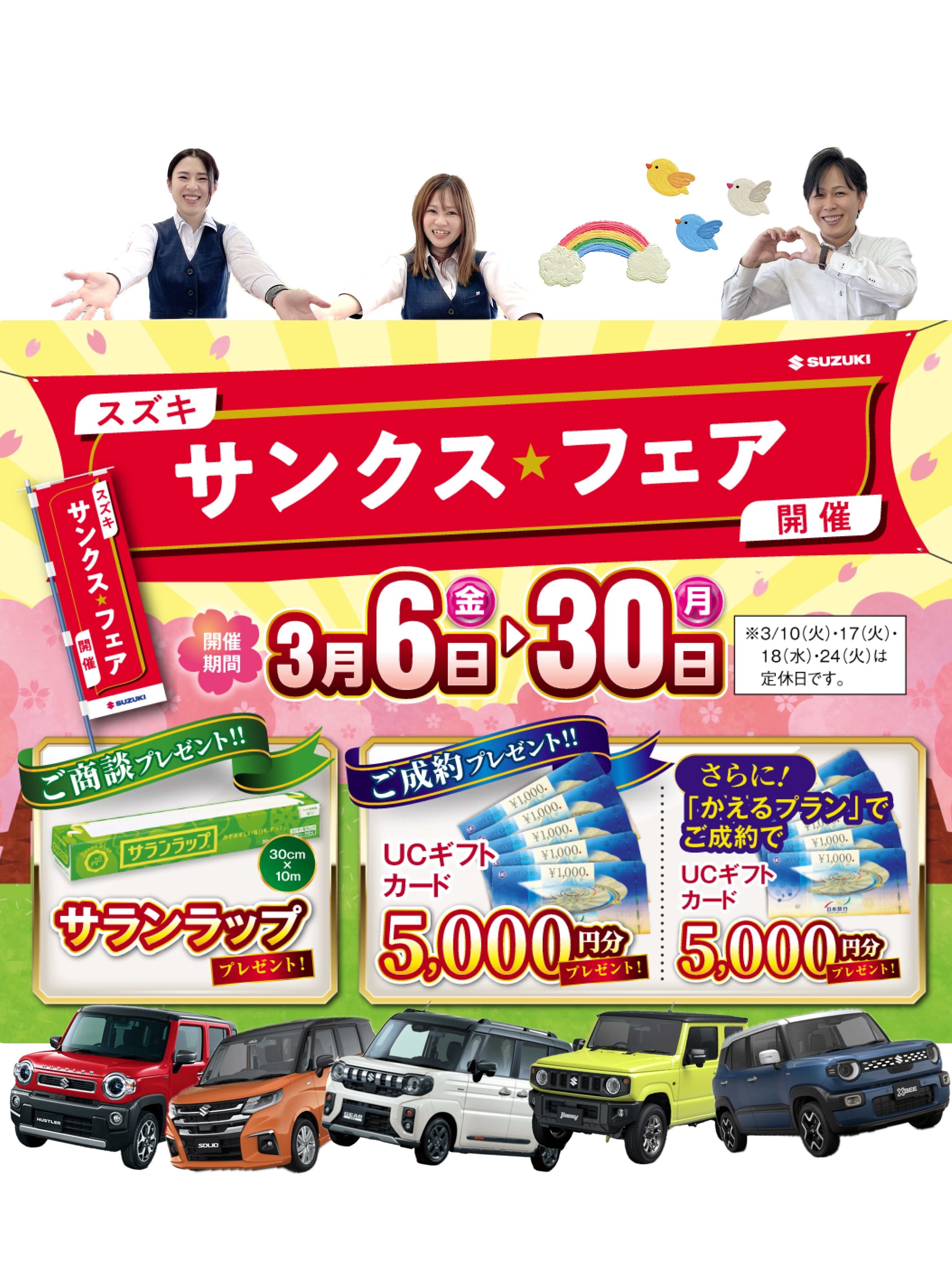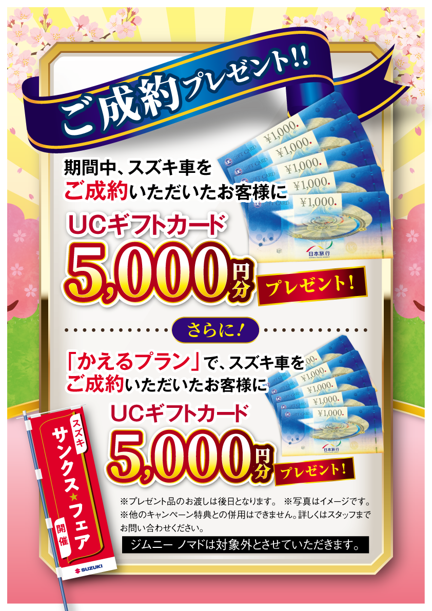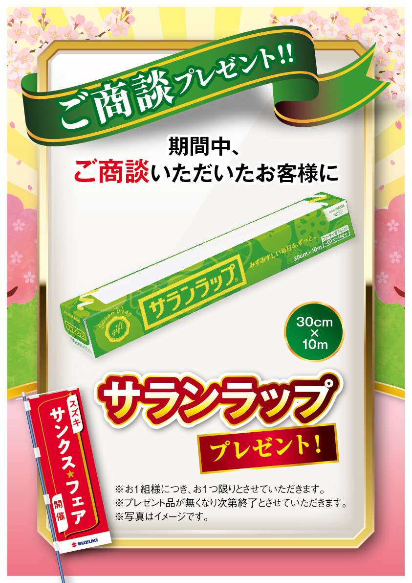 イベント/キャンペーン 2026.03.23 サンクス★フェア 3月30日まで開催中!! ※このイベントは終了しました スズキ★サンクスフェア 開催中 〈〈 開催期間 〉〉 3月6日(金)~3月30日(月) ※3月10日(火)・17日(火)・18日(水)・ 24日(火)は定休日です。 期間中、ご商談いただいたお客様に サランラッププレゼント 期間中、新車のご成約を頂くと UCギフト 5000円分プレゼント さらに! かえるプランで ご成約いただくと UCギフト 5000円分プレゼント ※いずれもジムニーノマド対象外です お得な機会にぜひ ご来店ください