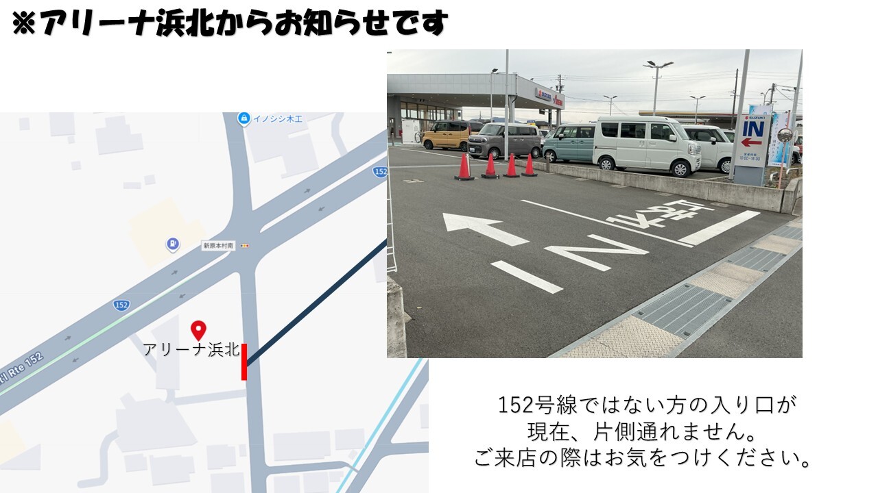 その他 2026.04.01 アリーナ浜北からのお知らせです アリーナ浜北からのお知らせです 現在、アリーナ浜北の152号線ではない方の入り口が 片側通れない状況でございます ご来店いただく際にはお気を付けいただきますようお願い申し上げます ご迷惑をお掛けし、大変申し訳ございませんが よろしくお願いいたします 皆さまのご来店、お待ちしております!