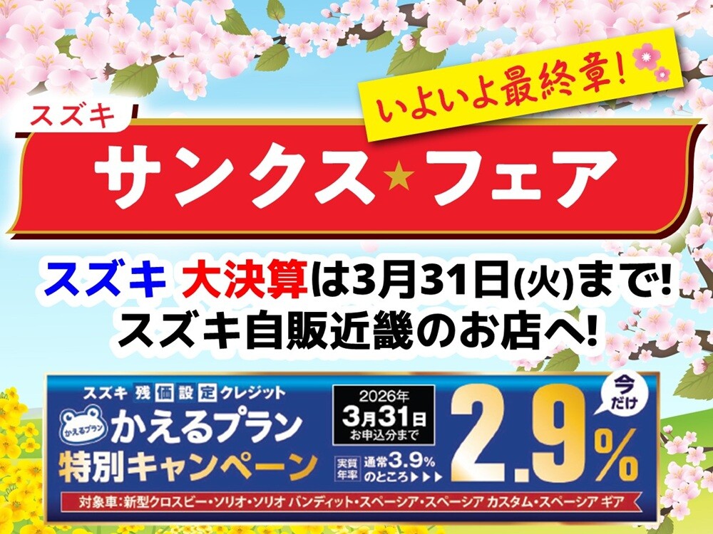 イベント/キャンペーン 2026.03.24 スズキ・サンクスフェア いつもお世話になっております!! サンクスフェアいよいよ最終章です!! 3月31日までです!! スズキ残価設定クレジット かえるプランの実質通常3.9%のところ 今だけ2.9%!! こちらも3月31日までとなっております!! お得な機会に是非一度!! スズキアリーナ高槻西店へ!! スタッフ一同心よりお待ちしております!!