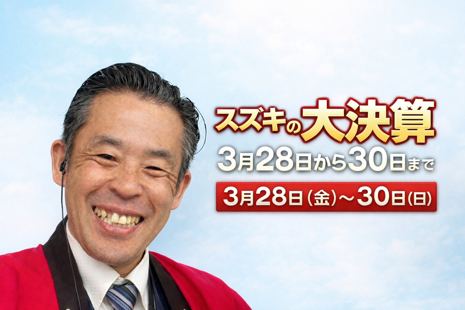 イベント/キャンペーン 2026.03.22 スズキの大決算スプリングフェアー!! ※このイベントは終了しました 皆様こんにちは! いつもアリーナ高陽ブログをご覧いただきありがとうございます! 先日のイベント期間中たくさんのご来店いただきありがとうございました!! 今週末もまだまだ決算イベント続きます! !!おクルマを買うなら今がチャンス!! 3月末までの特別金利 ソリオ スペーシア 新型クロスビー かえるプラン2.9% ぜひアリーナ高陽へご来店ください