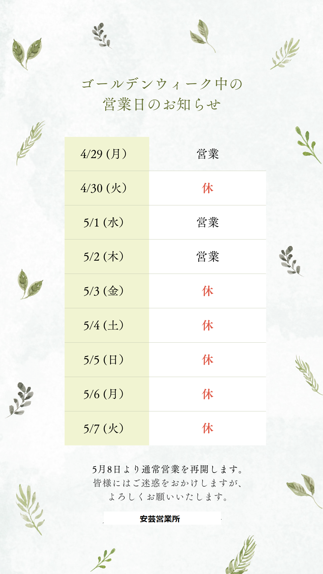 ゴールデンウィーク期間のお休みについて!