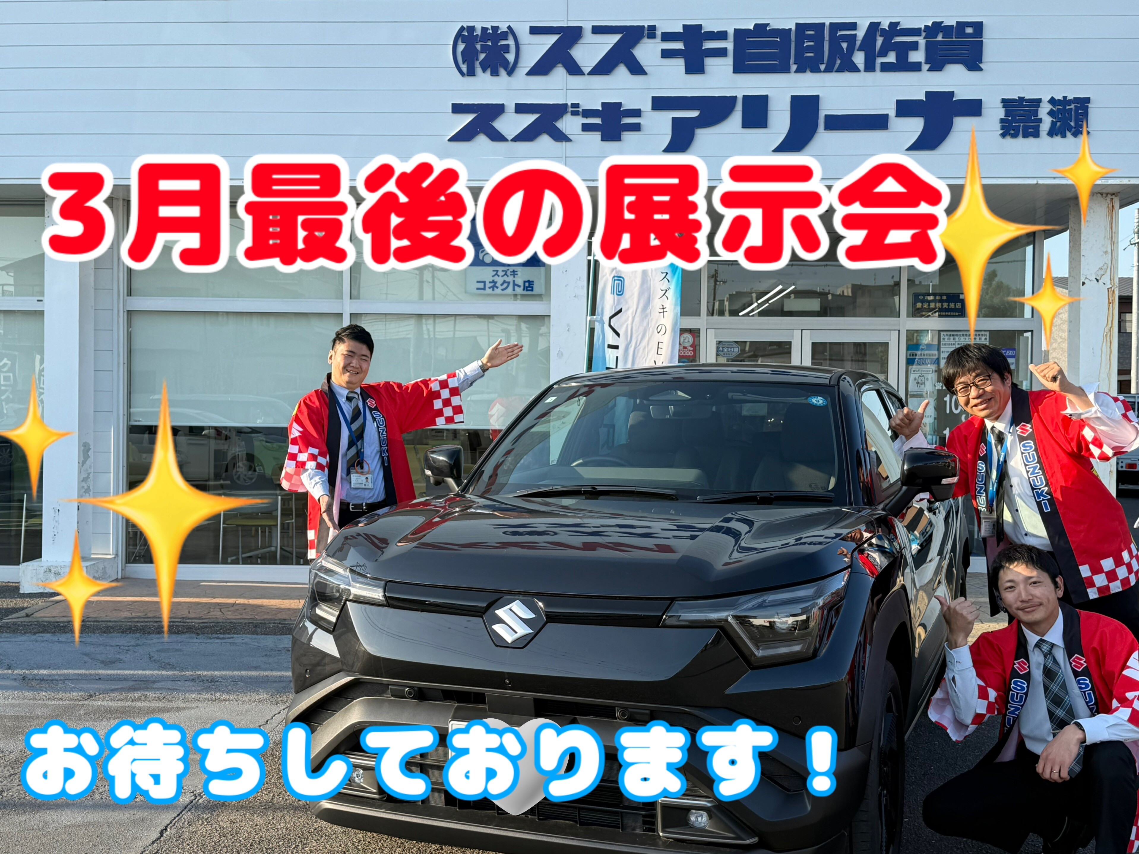イベント/キャンペーン 2026.03.26 アリーナ嘉瀬にてお待ちしております! みなさま、こんにちは! アリーナ嘉瀬のブログをご覧いただき、 誠にありがとうございます 今週末は 3月最後の展示会です! お得な機会をお見逃しなく! さらに! 3/29(日)まで アリーナ嘉瀬店にて eビターラのご試乗が可能です ご試乗の際はご予約いただけますと スムーズにご案内できます 残価設定クレジットかえるプラン 車種限定特別金利キャンペーンも 2026年3月31日お申込み分まで となっておりますので ご検討中の方はお急ぎくださいませ! みなさまのご来店を 心よりお待ちしております