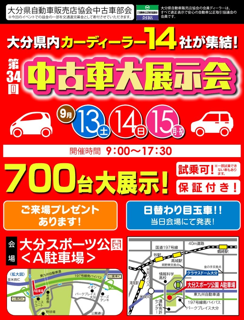 大分スポーツ公園A駐車場にて半年に一度の中古車大展示会が開催されます