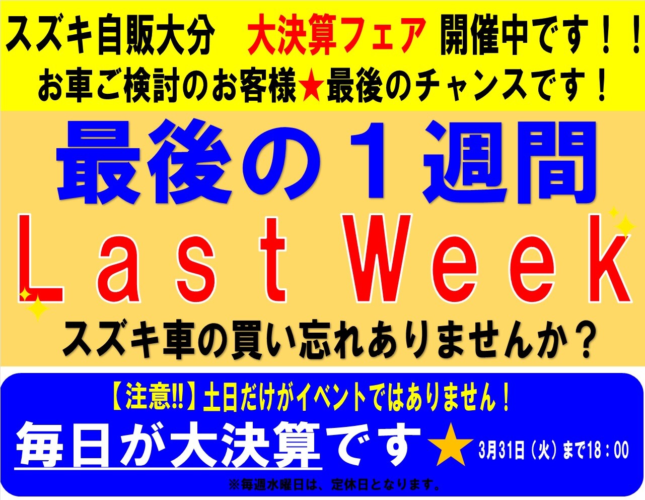 イベント/キャンペーン 2026.03.24 ★大決算フェア 最後の1週間★ スズキ車のお買い忘れありませんか?? 大決算フェアも最後の一週間です まだまだ間に合います 平日、お仕事帰りなどでもOK! スズキアリーナ佐伯まで ご来店、心よりお待ちしております