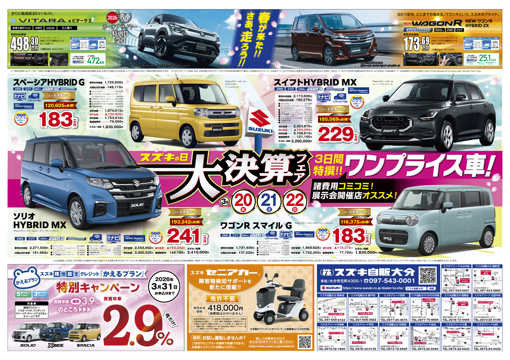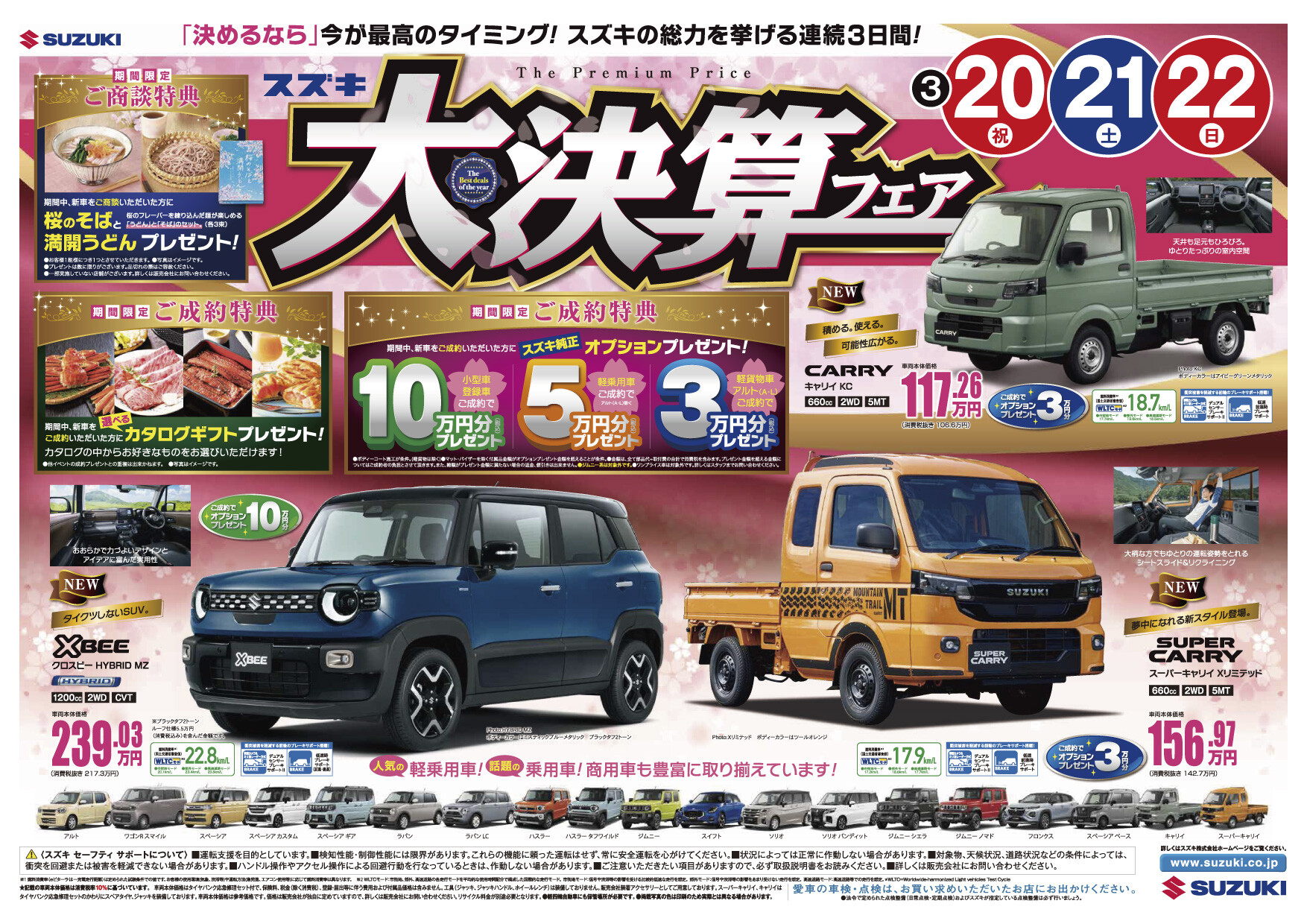 イベント/キャンペーン 2026.03.17 スズキ 大決算フェア 開催! ※このイベントは終了しました 3月20日(金・祝)・21日(土)・22日(日)は スズキ大決算フェア を開催いたします。 今回も様々な特典準備しております! 特典① 商談特典 桜そばと満開うどん 特典② 成約特典➊ えらべるカタログギフト 特典③ 成約特典❷ スズキ純正オプション 小型車・普通車 10万円分 軽乗用車 5万円分 軽貨物・アルト(A・L) 3万円分 それぞれプレゼント! 皆様ぜひお越しください!