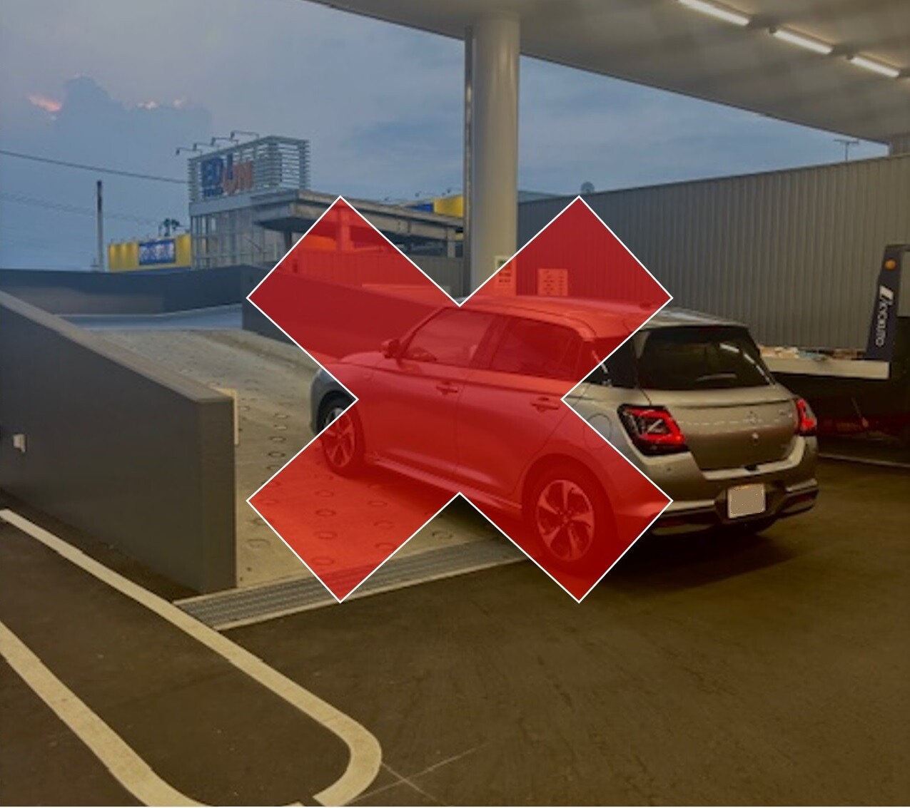 そのまま直進していただき、スロープ出入口の先に停車をお願いいたします。