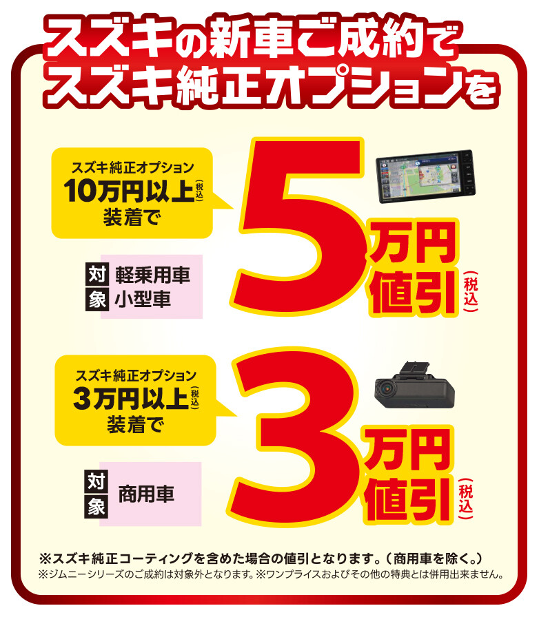 スズキ純正ボディコーティングを含めた場合の値引となります。(商用車を除く)