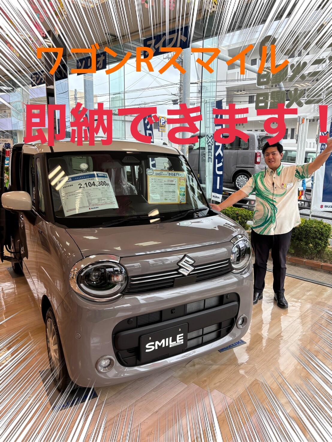 イベント/キャンペーン 2026.04.06 ワゴンRスマイル即納できます! 皆様こんにちは! いつもブログをご覧いただきまして ありがとうございます! 本日は、ワゴンRスマイルについて ご紹介します! 丸いヘッドライトに スクエアボディの 愛らしいデザイン 便利なスライドドア付きで 乗り降りラクラク 大きすぎず使いやすい ちょうどいいサイズ感 納車をお急ぎの方! すぐに乗れる車あります 詳しいグレードやお色など ぜひ店舗スタッフまで ご相談ください! 皆様のご来店、 お待ちしております