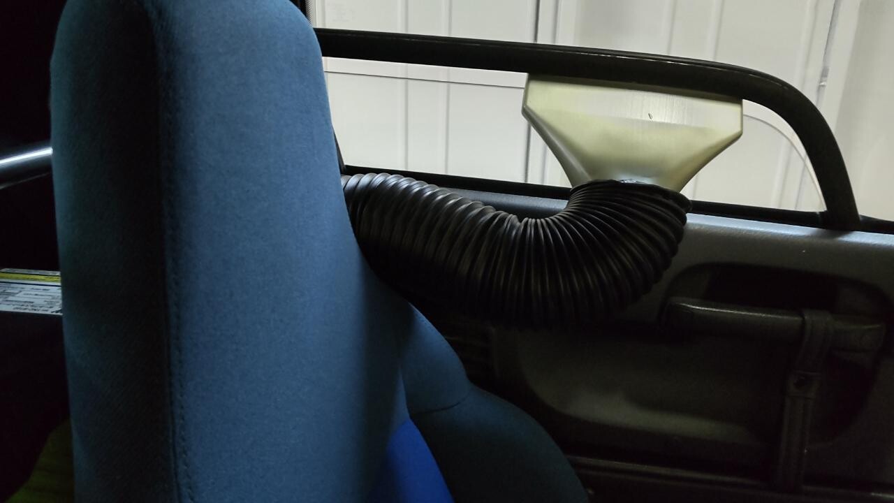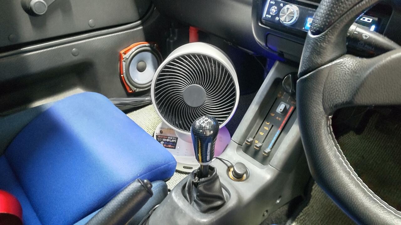家庭用のサーキュレーターを助手席側足元に設置して風が直接体に当たるようにしました。