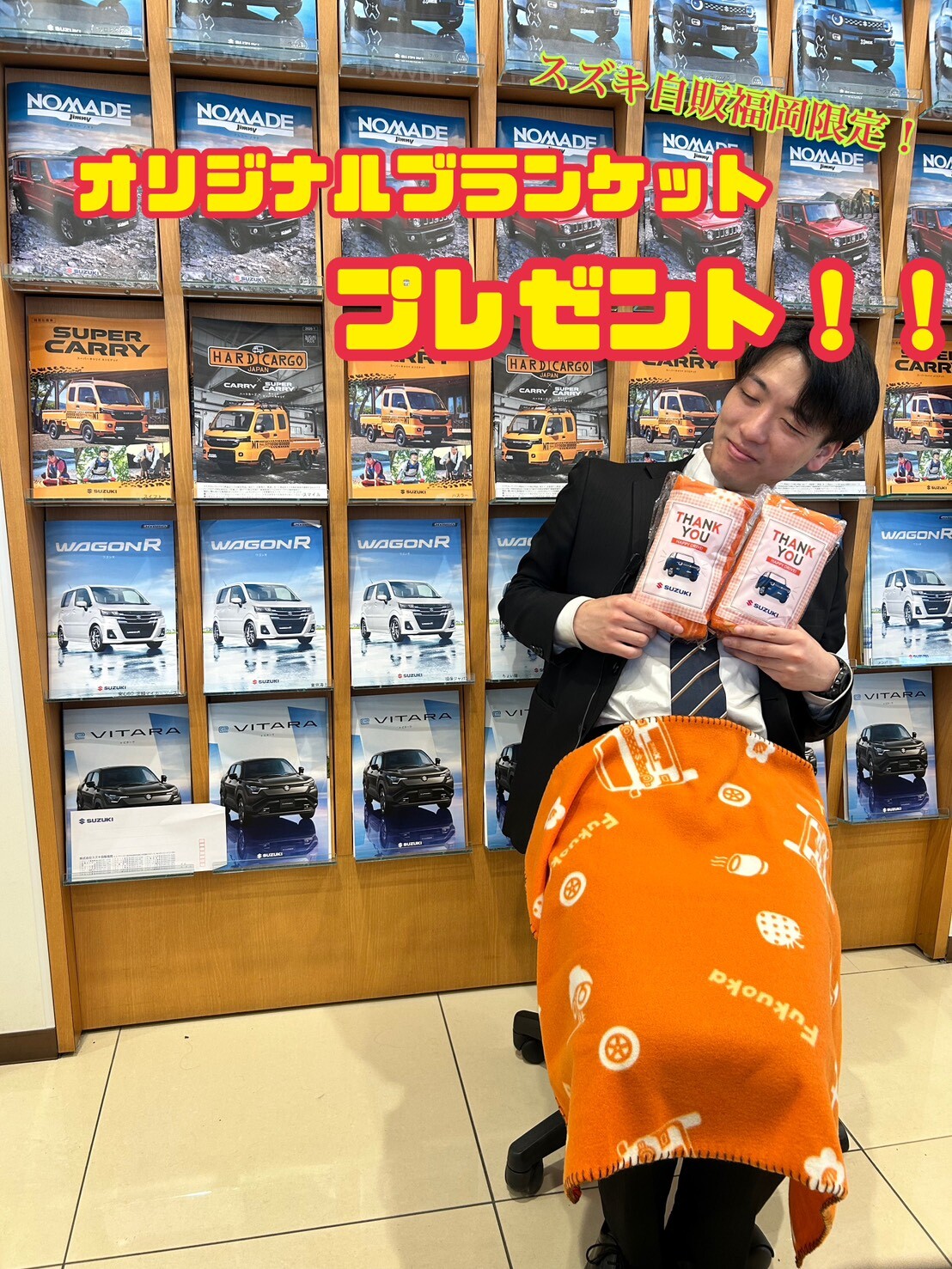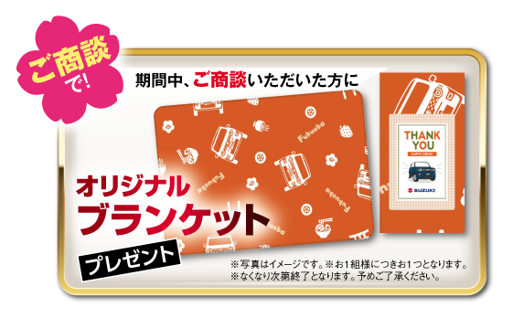 イベント/キャンペーン 2026.03.05 サンクスフェア!!3月7日から!! HPをご覧いただきありがとうございます!! 花粉がつらいですね そして3月は決算の月です 3月7日~3月15日で サンクス☆フェアが開催されます!! 商談いただいたお客様に 社長お墨付きの ブランケットをプレゼント!! スズキ自販福岡にしかありません!! 春先にちょうどいいですね!! 更に!! 決算だけのお得な内容になっています 期間中、新車をご成約いただいたお客様に オプションプレゼントがあります!! またご成約プレゼントも豪華に この機会にぜひたくさんのご来店をお待ちしております
