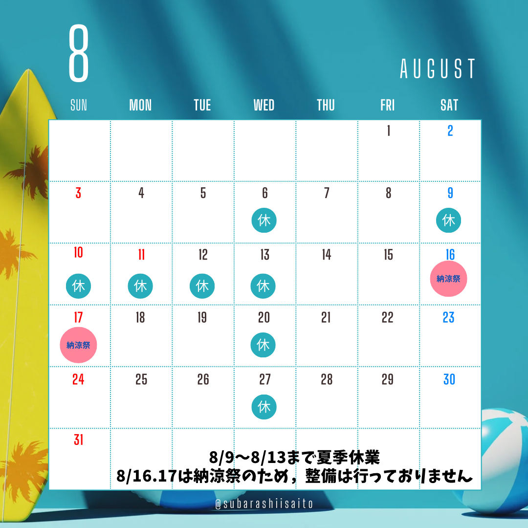 誠に勝手ながら、8/9(土)から8/13(水)は夏季休業いたします。