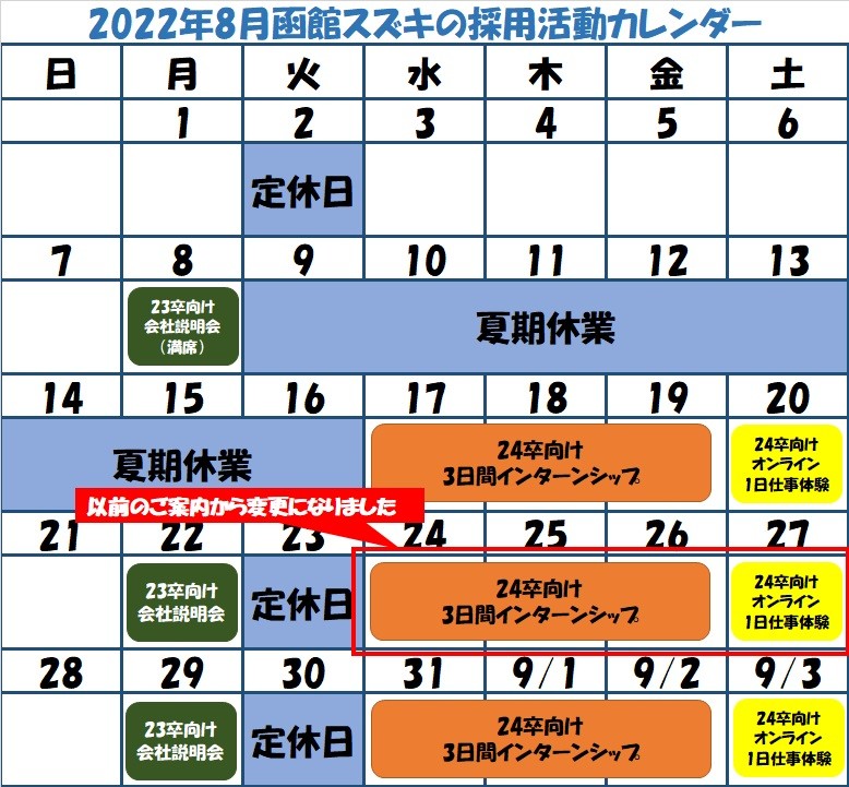 さて、先日8月の採用活動の予定についてご案内いたしましたが、一部予定変更があります。
