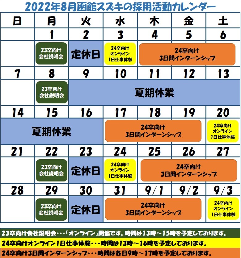 (なお、8月17日~19日開催予定の3日間インターンシップは、当社夏季休業の為、8月8日までの申し込みをお願いいたします)