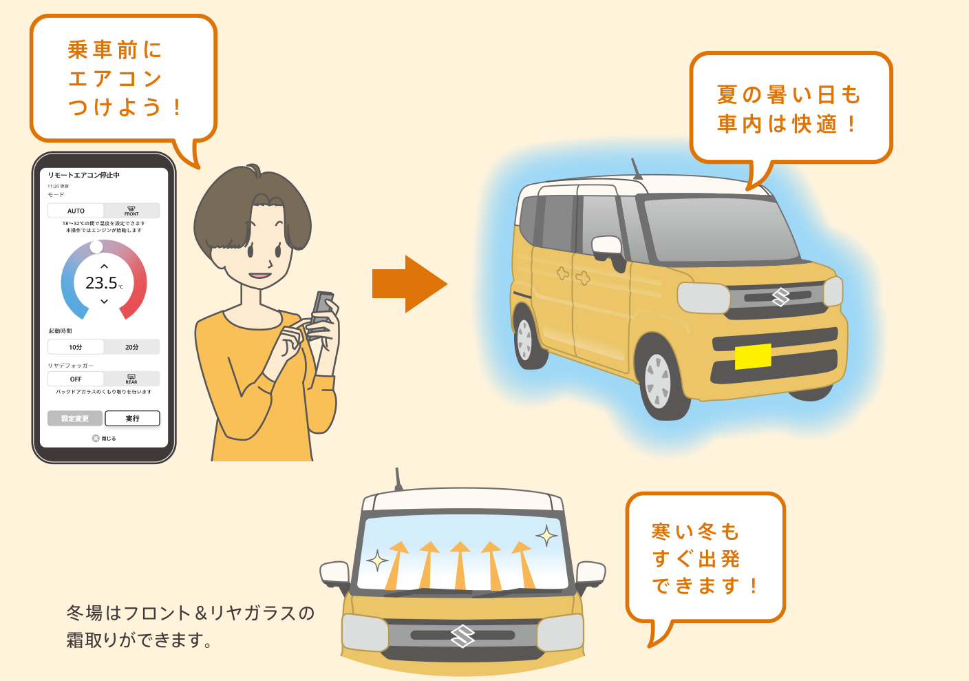 車に移動せずアプリからエアコン操作をし、冬場の霜取りとして活躍します。