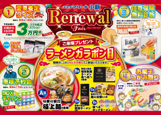 イベント/キャンペーン 2026.03.10 スズキアリーナ小新 リニューアルフェア開催中です! こんにちは! スズキ自販新潟です スズキアリーナ小新店では 店内の什器入替に伴い、リニューアルフェアを 3月15日(日)まで開催中です! ご来場プレゼントのラーメンガラポン抽選会は ハズレなし! 愛車査定クイズや車検予約会、任意保険診断会 お子様限定のお菓子つかみ取り また、スズキのオリジナルグッズが買える 展示即売会も実施中です!! 楽しいイベント盛りだくさんです! スタッフ一同、みなさまのご来場をお待ちしております