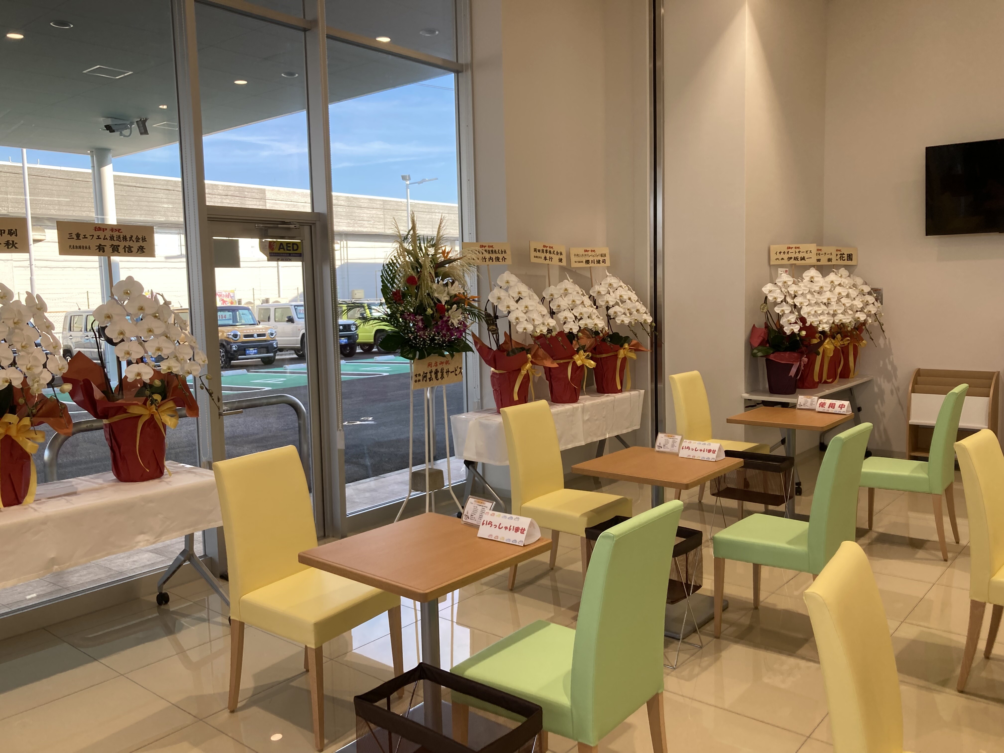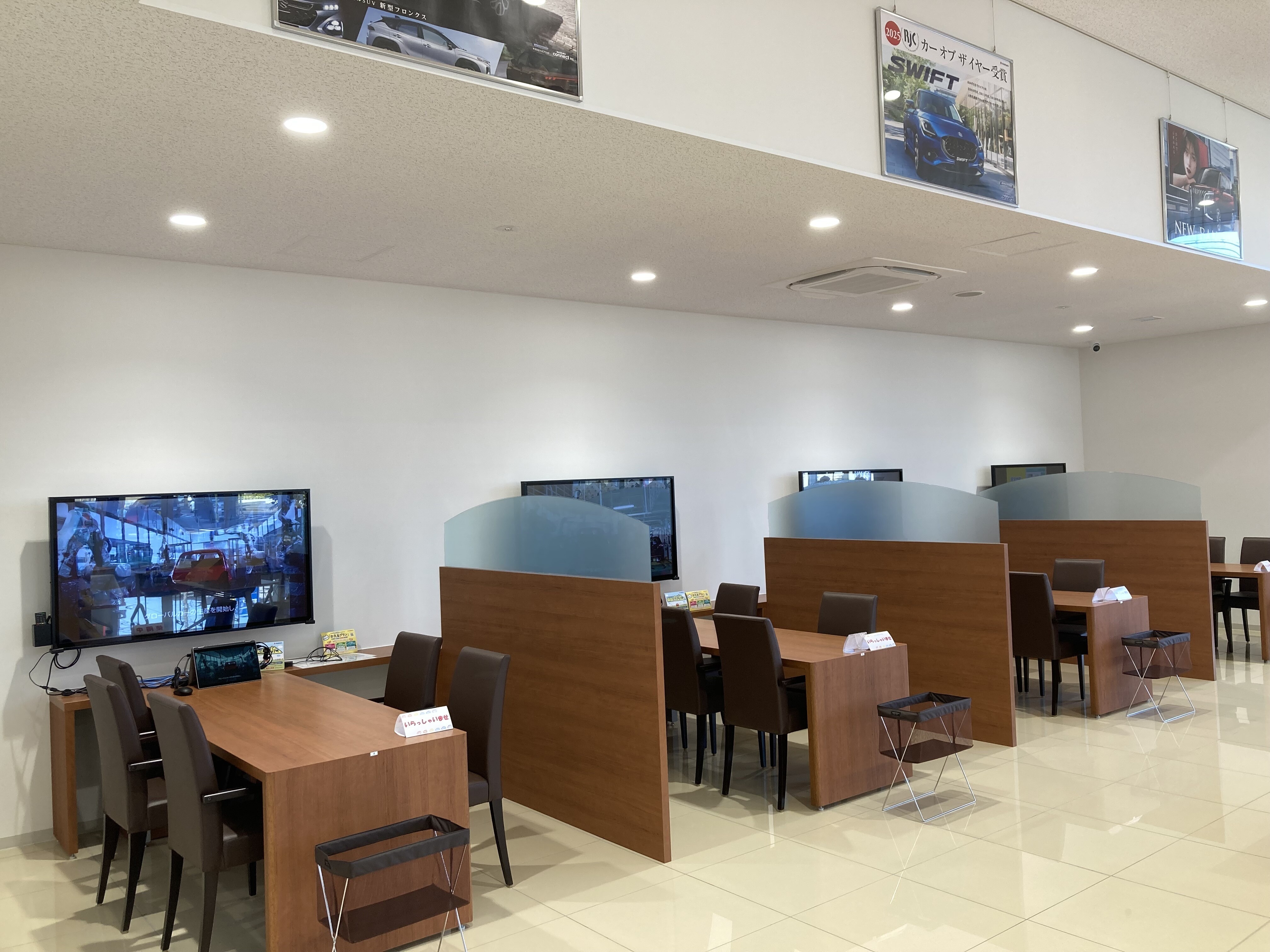 商談テーブルも広めに作り、モニターを見ながらおクルマのご説明できるようになっております。