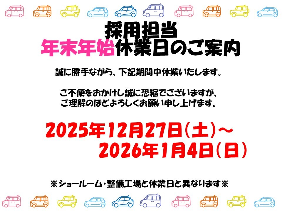 ☆採用担当 年末年始の休業日について☆